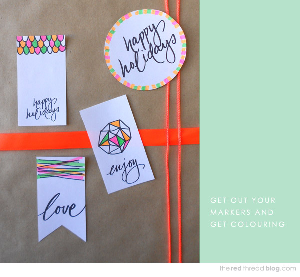 How’s your Christmas shopping going? I’m still only half done, but I have started to wrap my purchases. I thought you might like to use the holiday gift tags that I made, so I’m offering them as a free printable download. There are two versions: colour and black + white. That gives you the option to use either of them, or to get creative and colour them yourself to match your theme and wrapping paper. If you’re having a neon Christmas break out the neon markers and embellish the printables, or if you’re going with bling try adding glitter.