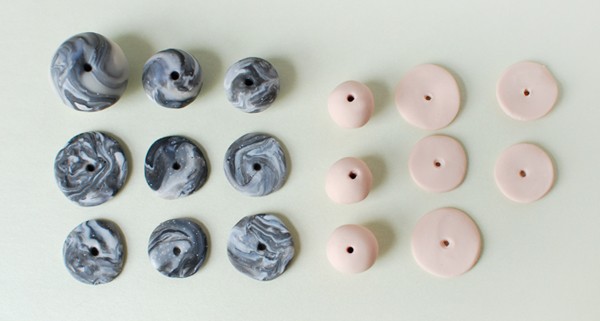 You can easily change the tone of the marble as you go along by adding more of any colour. For the necklace, I added more black into the mix. I also made some blush-coloured clay out of white and tiny amounts of pink and yellow.