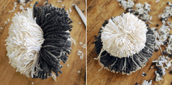 After you’ve removed the pom from the maker, separate the cream and grey sections by smoothing the grey yarn downwards.