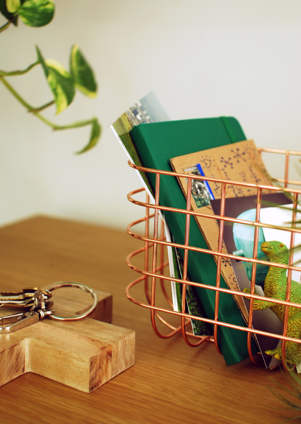 The beautiful rose gold tones in the copper basket also picks up the metallic spots in Freedom’s gorgeous new Golden Confetti artwork, which I hung above the console.